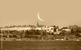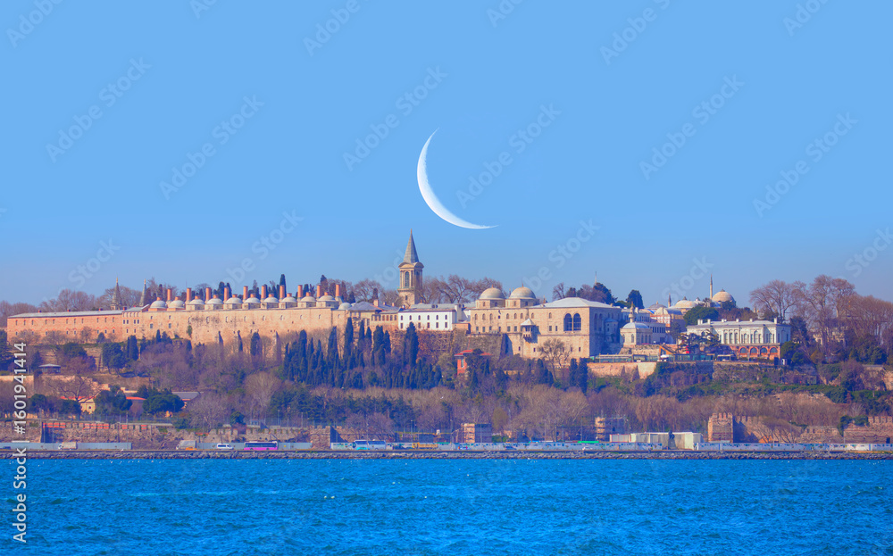 Topkapi Palace, crescent moon in the background - Famous historical peninsula in Bosphorus - Istanbul, Turkey