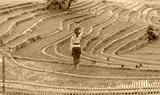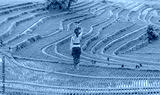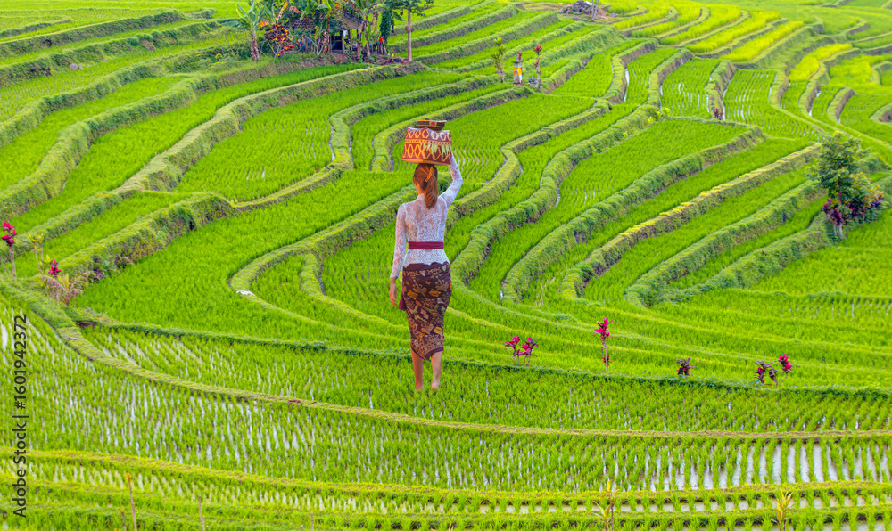 Beautiful balinese girl in traditional costume walking on rice terrace path