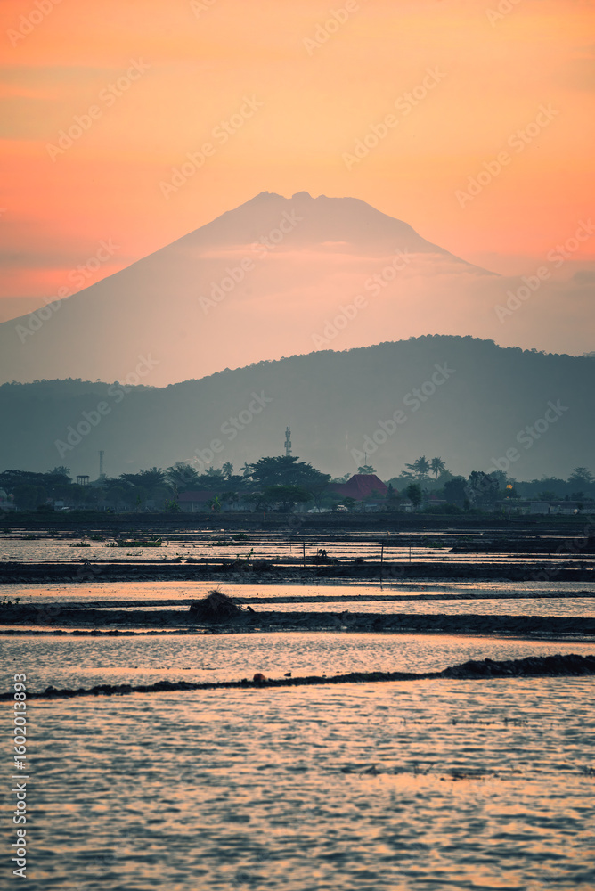 Layered Serenity: A Hazy Volcano Overlooking a Village and Flooded Fields at Sunset.