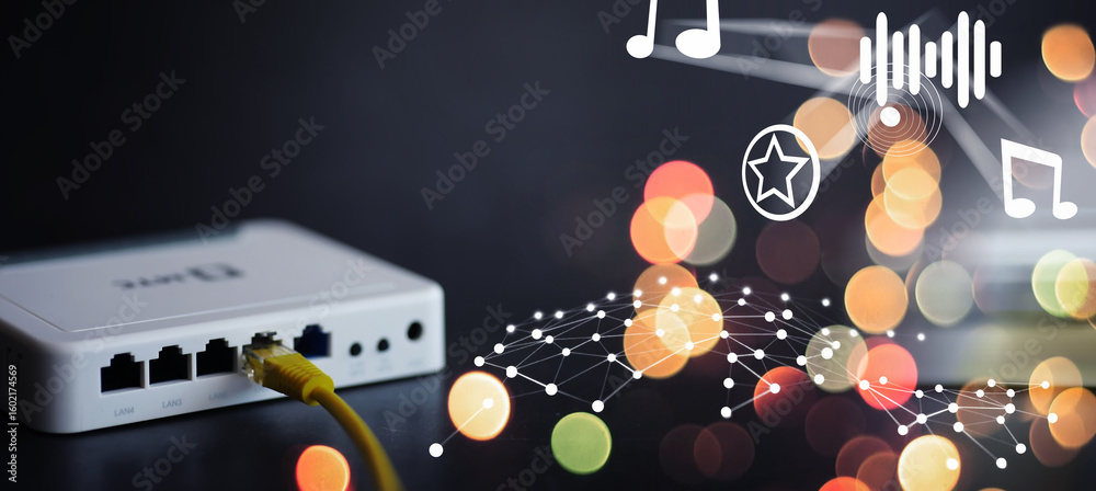 Home wireless router with ethernet cables plugged in, close up.Modern dual band wireless router. Man working in the background.