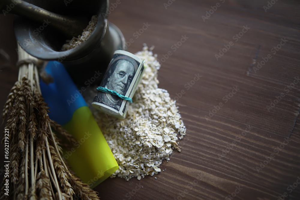 The concept of the cost of grain. 5000 ruble banknotes around a handful of ground grain. World hunger.