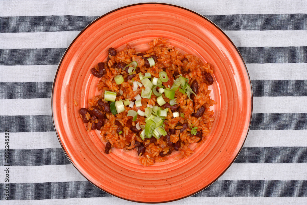 This high-angle, top-down studio shot features a vibrant serving of rice with tomatoes and beans, generously topped with fresh green onions, all on a striking striped tablecloth