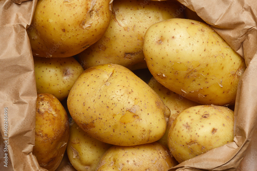 A close-up, top-down view shows numerous fresh, unwashed yellow potatoes nestled inside a crumpled brown paper bag