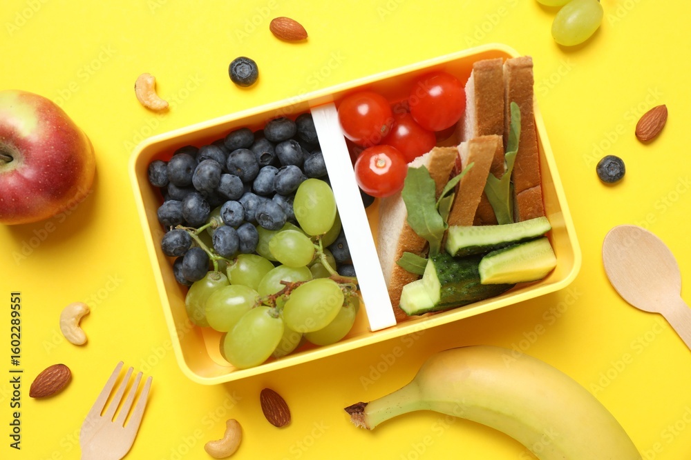 Healthy food concept with lunch box with fresh fruits, nuts, sandwich and vegetables