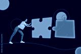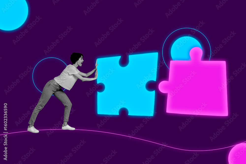 Sketch pop image sketch banner collage of happy businesswoman push puzzle element jigsaw aim achievement strategy element