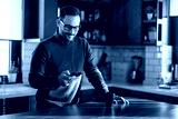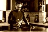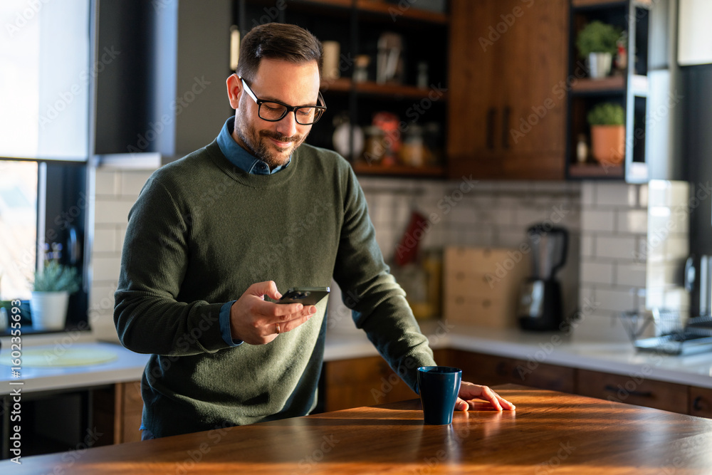 Happy smiling businessman wearing casual clothes and using modern smartphone in his home office