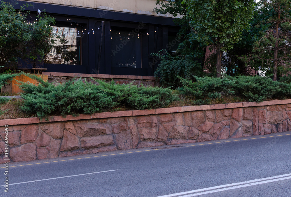 view of the green juniper next to the highway, granite wall and against the background of the black wall of the building