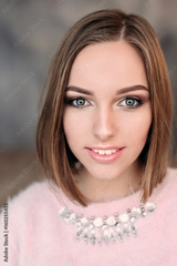 Soft photo of fresh young woman in pink tender sweater smiling. Pretty girl enjoying early sunny morning at home.