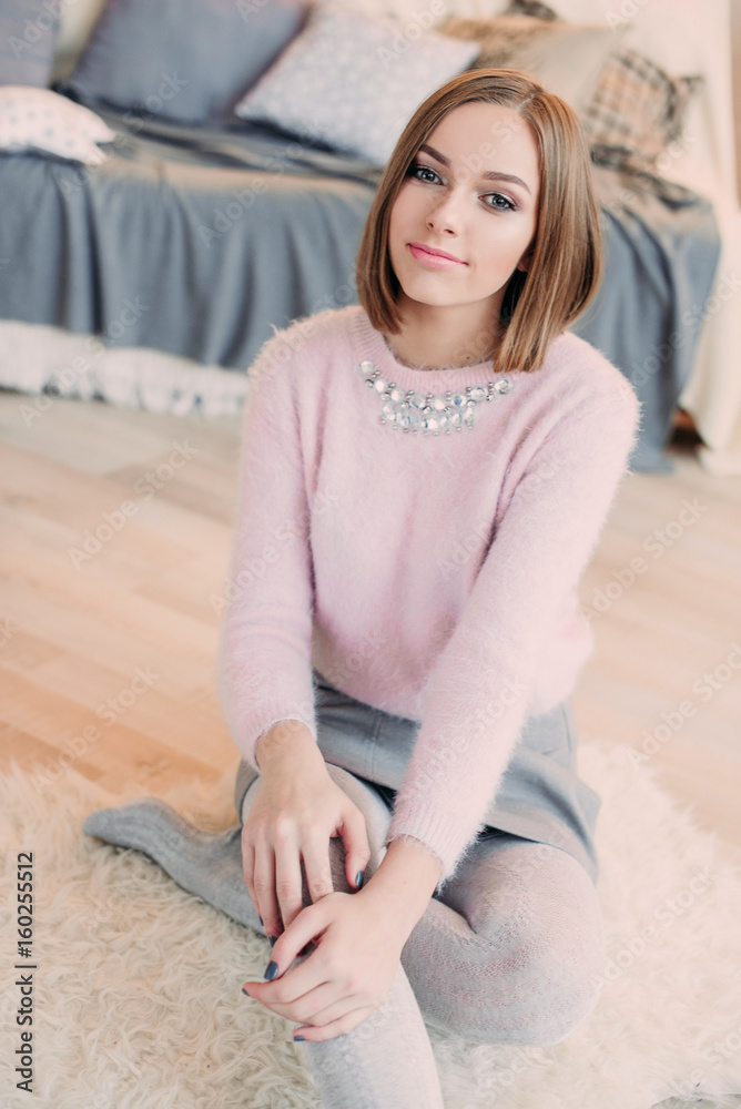 Soft photo of fresh young woman in pink tender sweater smiling. Pretty girl enjoying early sunny morning at home.