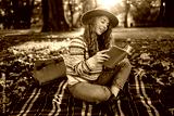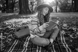 Portrait of a beautiful woman with a book in her hands relaxing on a blanket in a sunny forest. Smiling woman enjoying reading a book outdoors. Relaxation, nature and autumn concept.