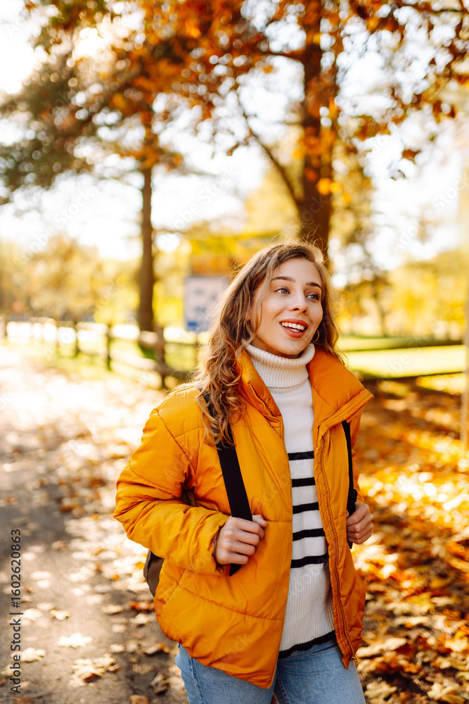 A cute woman in a bright jacket walks through a yellow autumn park. A young tourist with a backpack enjoys a sunny day and autumn landscape outdoors. Nature, recreation concept.