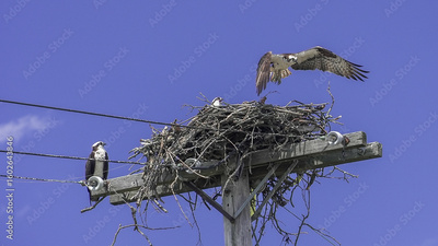 Osprey pair tending to their nest on a utility pole during a sunny afternoon