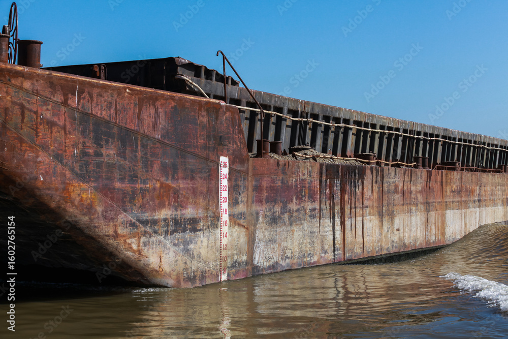 Rustic Metal Cargo Barge Floating on Calm Waters Under Clear Blue Sky