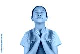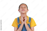 Portrait of happy Asian girl child using wireless headphones enjoy with music isolated on white background.