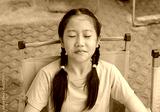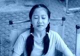 Close-up portrait of Asian young girl child age about 11 years old while sitting on chair and closed eyes.