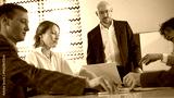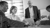 The serious director of the company looks down at the negotiating table with displeasure. A crisis at work. A group of office people are sitting at a table