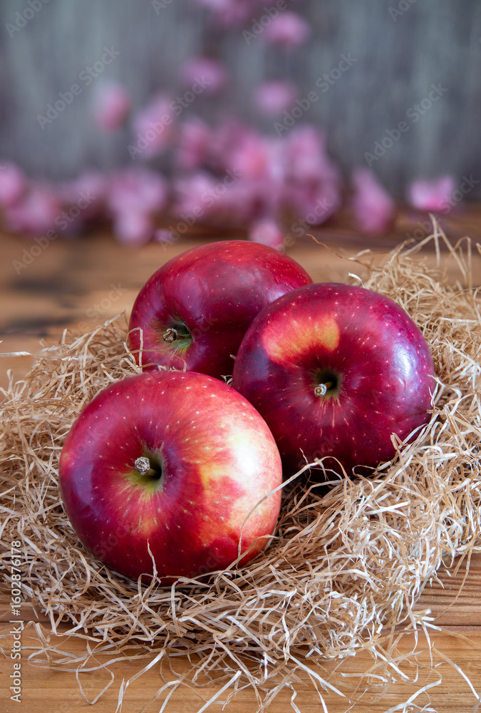 Fresh red apples resting in cardboard box on wooden table
