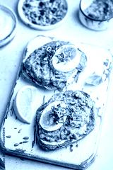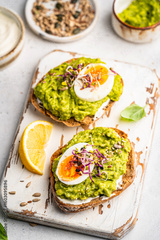 Toast with avocado, feta cheese, eggs, herbs and seeds with lemon slices on white background. Healthy eating and wholesome Breakfast