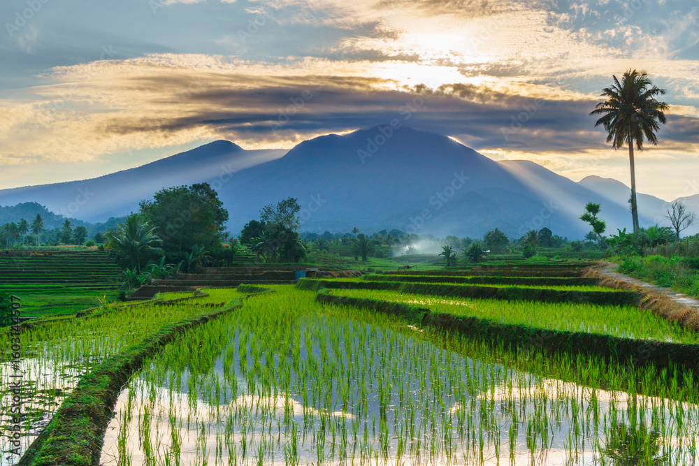 Beautiful morning view indonesia panorama landscape paddy fields with beauty color and sky natural light