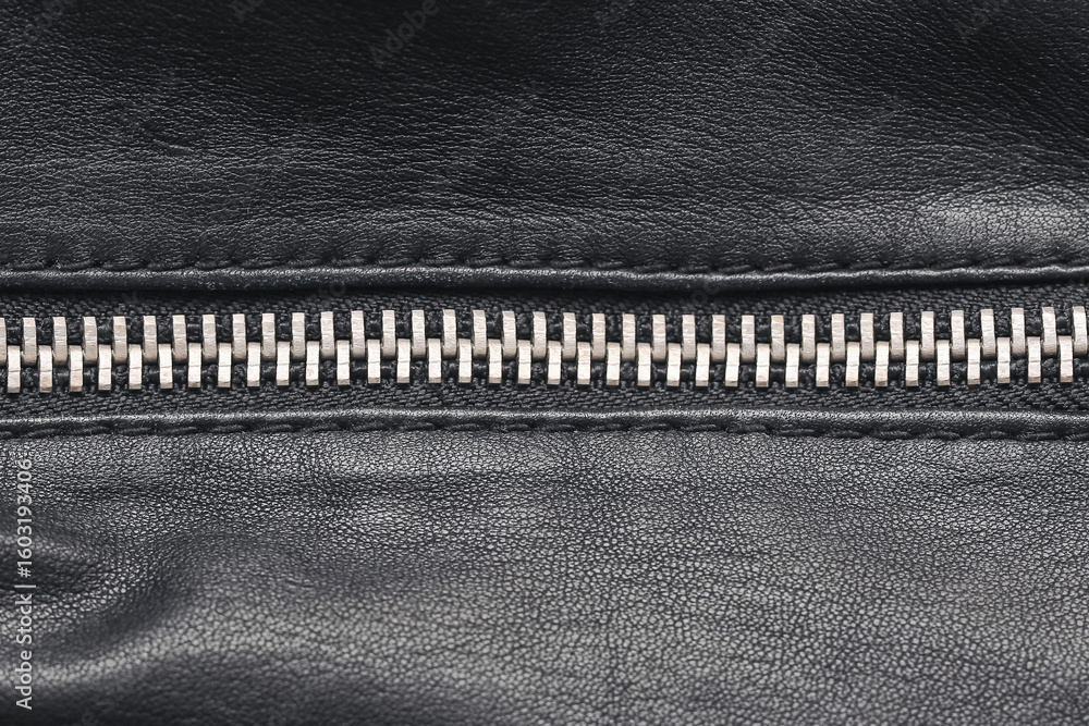 Black leather jacket zipper closeup. Shiny metal teeth and textured leather surface. Stylish fashion detail on dark background. Horizontal view of fabric seam and fastener element in macro shot.