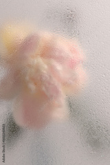 Smoke selected soft focus cream beige pink Peony Flower through glass with wet water drops. Abstract natural blur background.