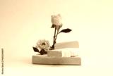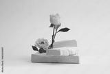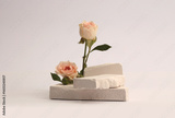 Stones platform podium, beige cream Rose flower bouquet on gray neuyral background. Minimal empty pedestal for product presentation scene.
