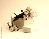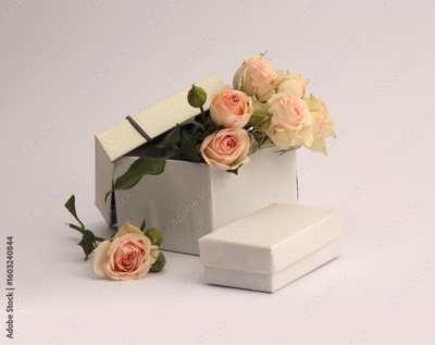 Craft gift boxes with beige cream rose flower bouquet on gray neutral background. Minimal empty pedestal podium for product presentation scene.
