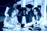 A diverse group of focused students actively collaborating on an exciting academic project with documents and devices, showcasing teamwork and engagement in a learning environment.