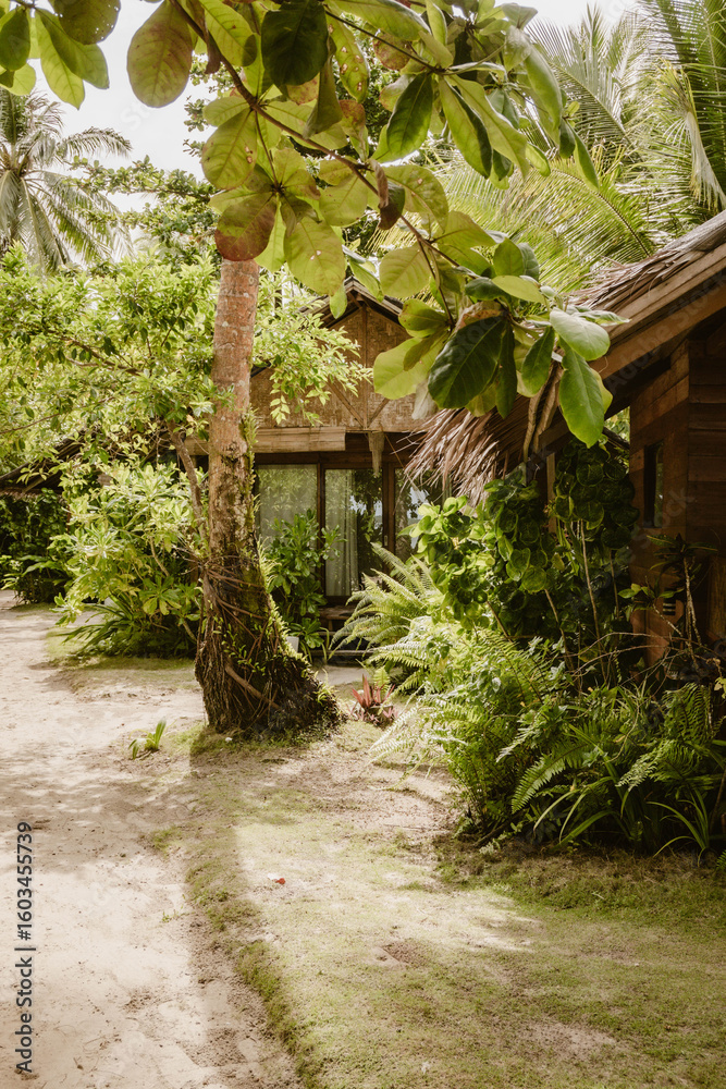 Vertical image of a building exterior of wooden holiday homes made with natural material surrounded by lush tropical greenery outdoor at daytime during a summer holiday in the Philippines in Asia.