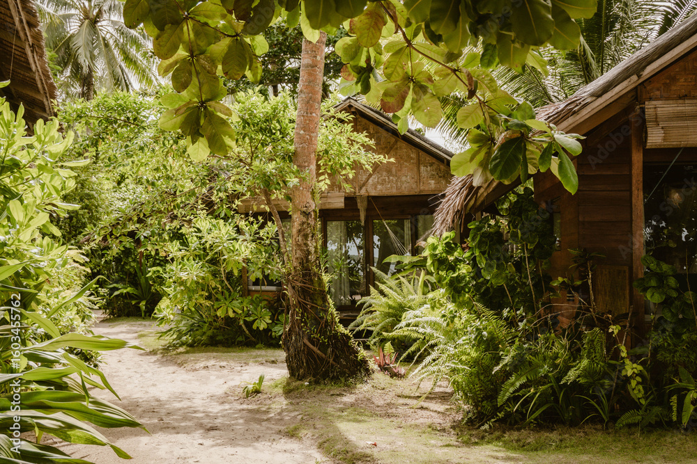Building exterior of wooden holiday homes made with natural material surrounded by lush tropical greenery outdoor at daytime during a summer holiday in the Philippines in Asia.