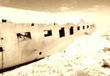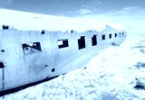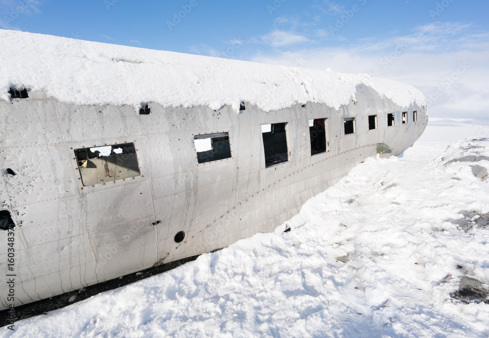 Old plane wreck on snow covered landscape by day, Iceland, Europe.