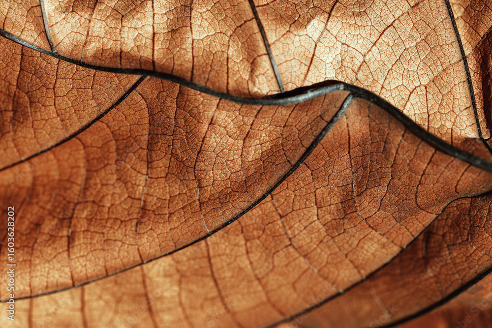 Autumn Dried leaf closeup at sunlight, macro trend, brown leaf as nature background. Fall aesthetic backdrop with natural veins texture of foliage, warm monochrome autumnal color, low depth of field