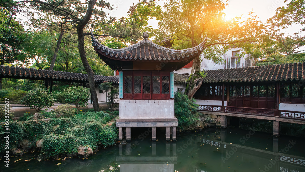 Traditional Chinese Pavilion by the Pond with Sunset Glow