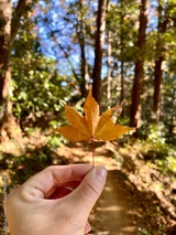 Vertical video of a woman’s hand holding a colourful autumn maple tree leaf outdoor at daytime in the forest during fall season in Japan.