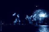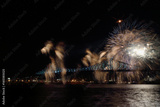Colorful fireworks explode over bridge, reflection in water. Montreal’s 375th anniversary. luminous colorful interactive Jacques Cartier Bridge. Bridge panoramic colorful silhouette by night.