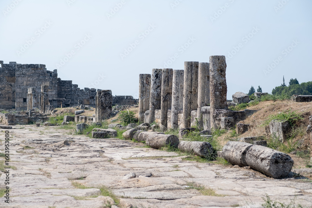 Ruins of Pamukkale Showcasing Ancient Columns and Historical Architecture on a Clear Day