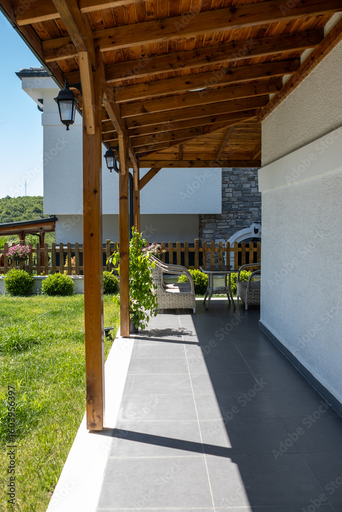 Relaxing Outdoor Patio in a Lush Garden Setting During a Sunny Day Perfect for Gatherings or Solitude