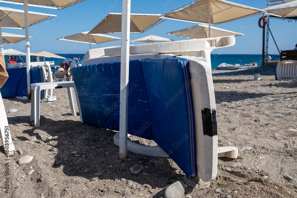 Relaxing Beach Day With Overturned Sunbeds and Umbrellas at a Coastal Location During Bright Sunny Weather in Summer