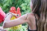 Child celebrates at gathering with colorful pinata during outdoor festive activity in summer