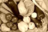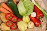 A vibrant assortment of fresh vegetables, including lettuce, tomatoes, peppers, carrots, zucchini, potatoes, garlic, and green onions, is neatly arranged on a brown paper background