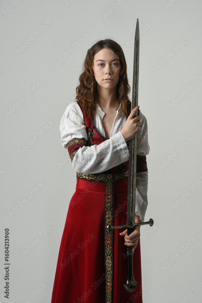 portrait of pretty young female brunette model wearing a red medieval historical gown holding fantasy sword weapon. standing pose, Isolated figure on white studio background.