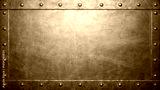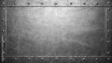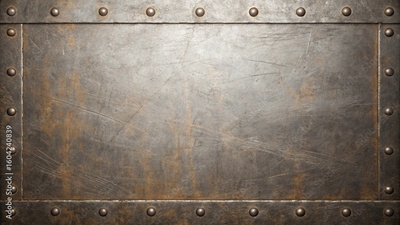 A textured metal plate with rivets creates a strong industrial background for various creative projects and designs