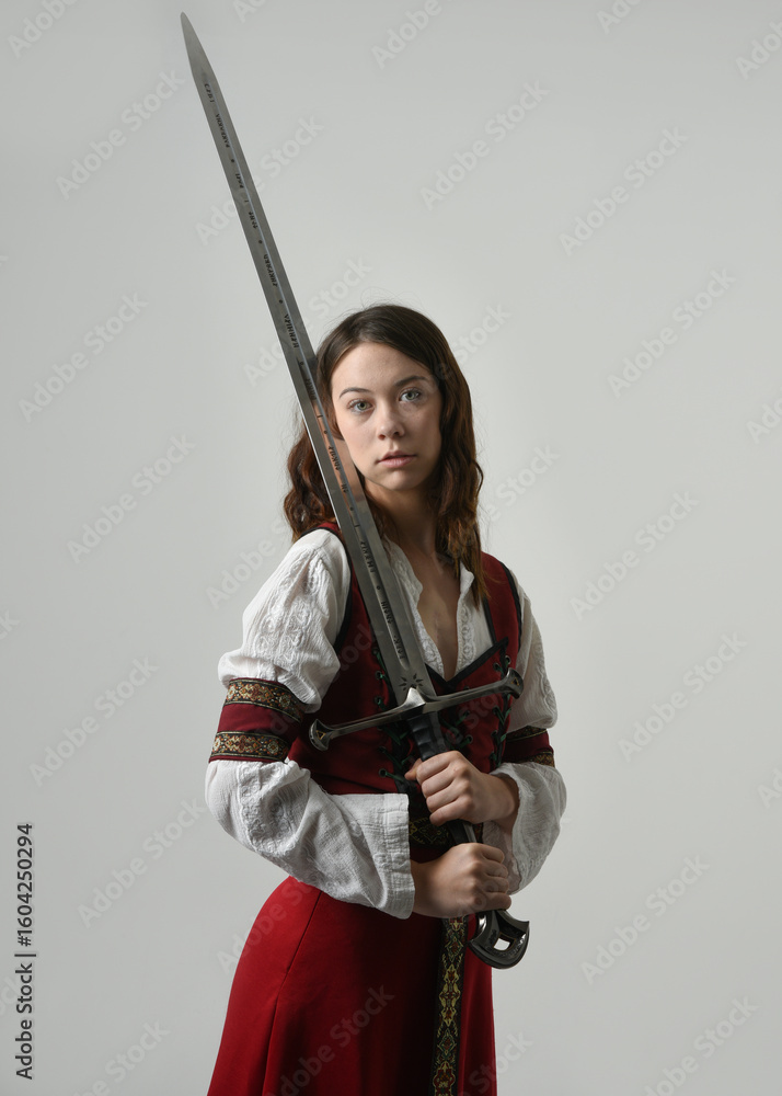 portrait of pretty young female brunette model wearing a red medieval historical gown holding fantasy sword weapon. standing pose, Isolated figure on white studio background.