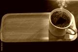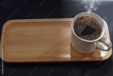 Hot black coffee cup on an empty wooden tray