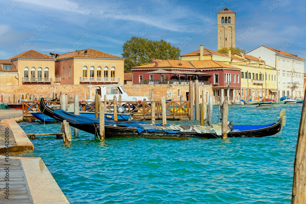 Traditional Venetian waterfront scene on Murano island with gondolas, colorful buildings, and a historic bell tower under sunny skies.