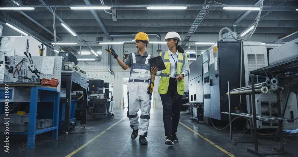 Two Male and a Female Factory Employees Walk Through a High Tech Manufacturing Facility, Discussing Operations and Production Machinery. Diverse Employees Wear Safety Gear and Carry a Tablet Computer