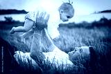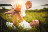 father and baby child girl at the sunset lay on the grass on the waterscape view from back