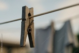 Old-style wooden clothespin hanging on laundry line outdoors, depicting domestic chores and rustic lifestyle