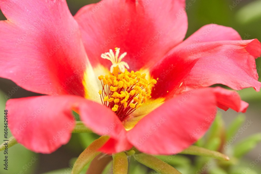 Bright red flower with yellow center in garden setting captured close up showing vivid colors.
