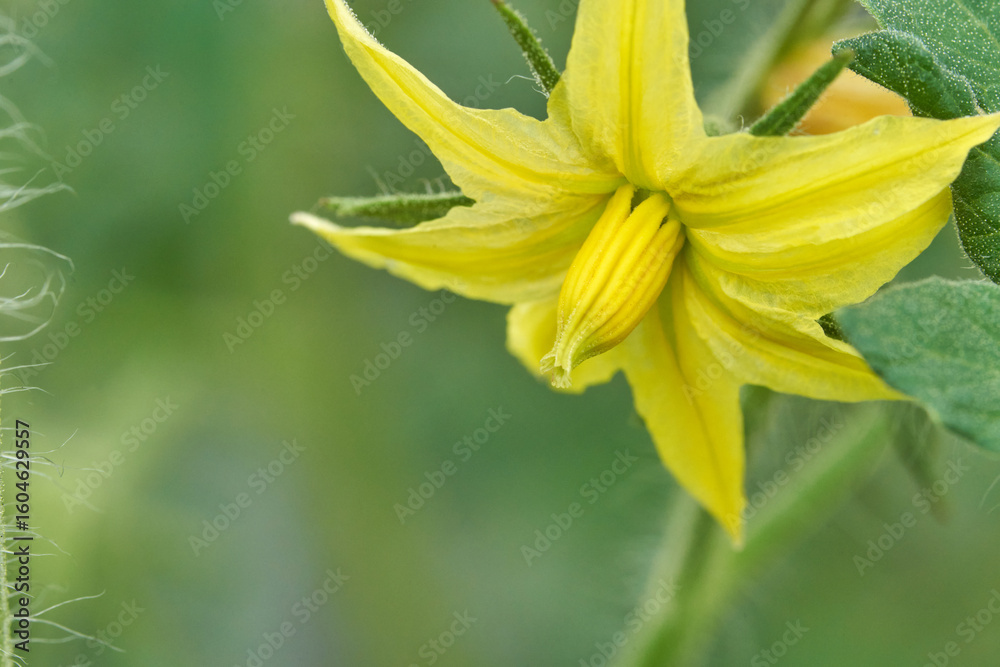 Close up of yellow tomato blossom against green foliage in a garden setting.
